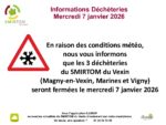 Etant donné les conditions météorologiques de ce jour (mercredi 07/01/2026), nous vous informons que les déchèteries de MAGNY EN VEXIN, MARINES et VIGNY resteront fermées pour la journée.