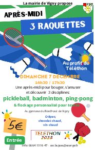 Après-midi 3 raquettes au profit du téléthon le dimanche 7 décembre de 14 h 30 à 17 h 30 au Gymnase de Vigny